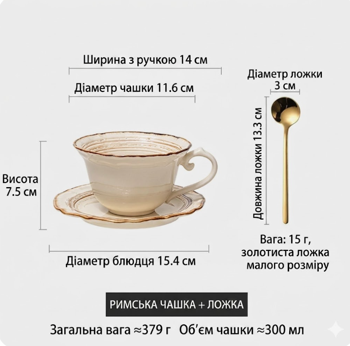 Вінтажна керамічна кавова чашка з блюдцем та ложкою в римському стилі 280 мл