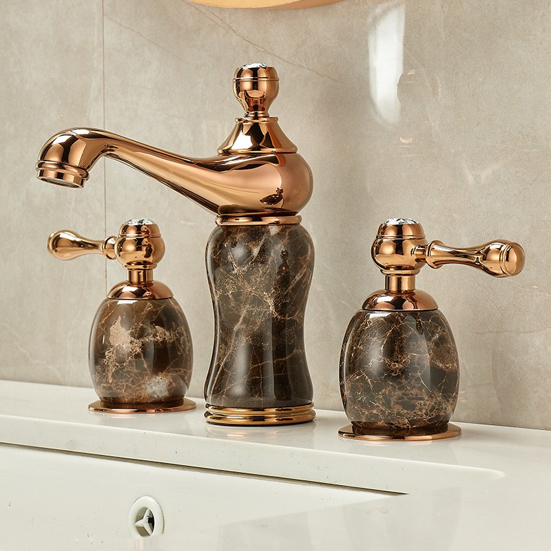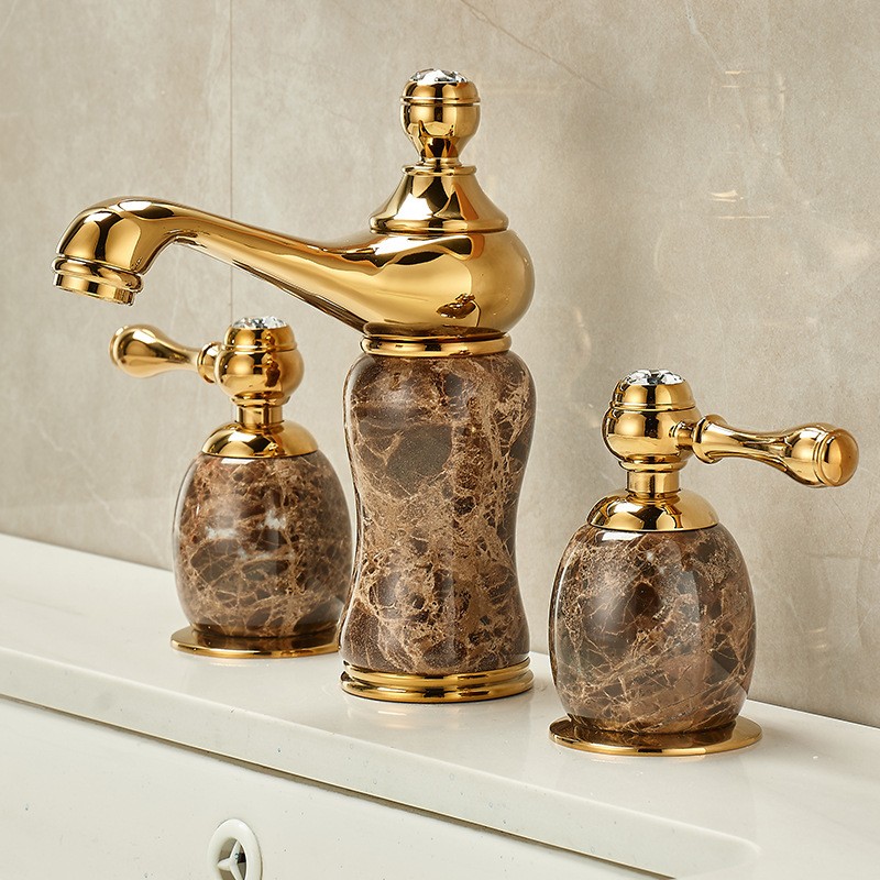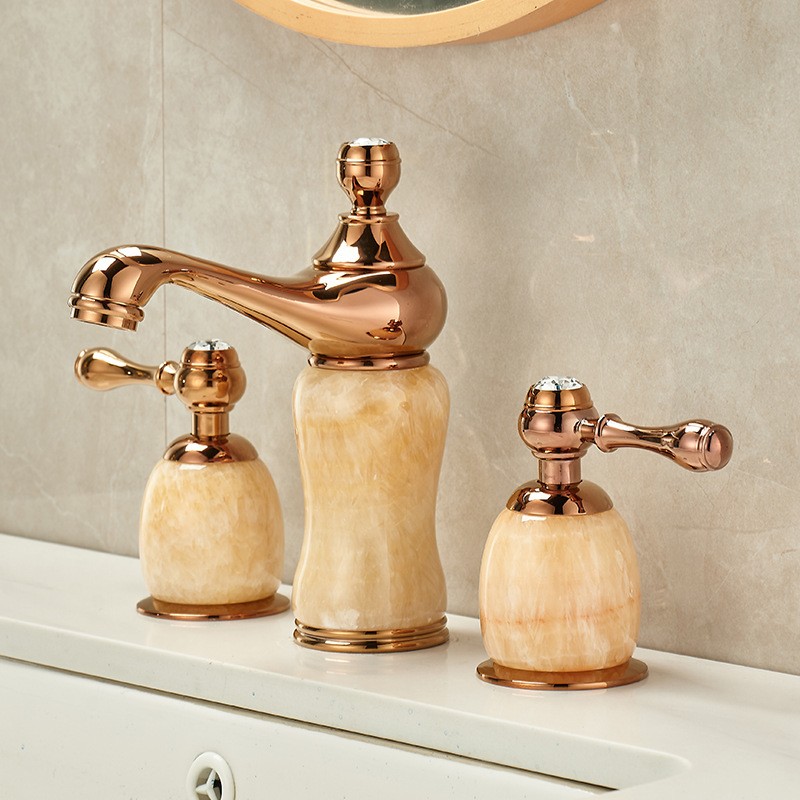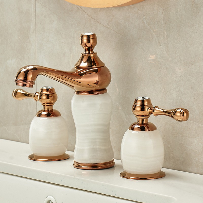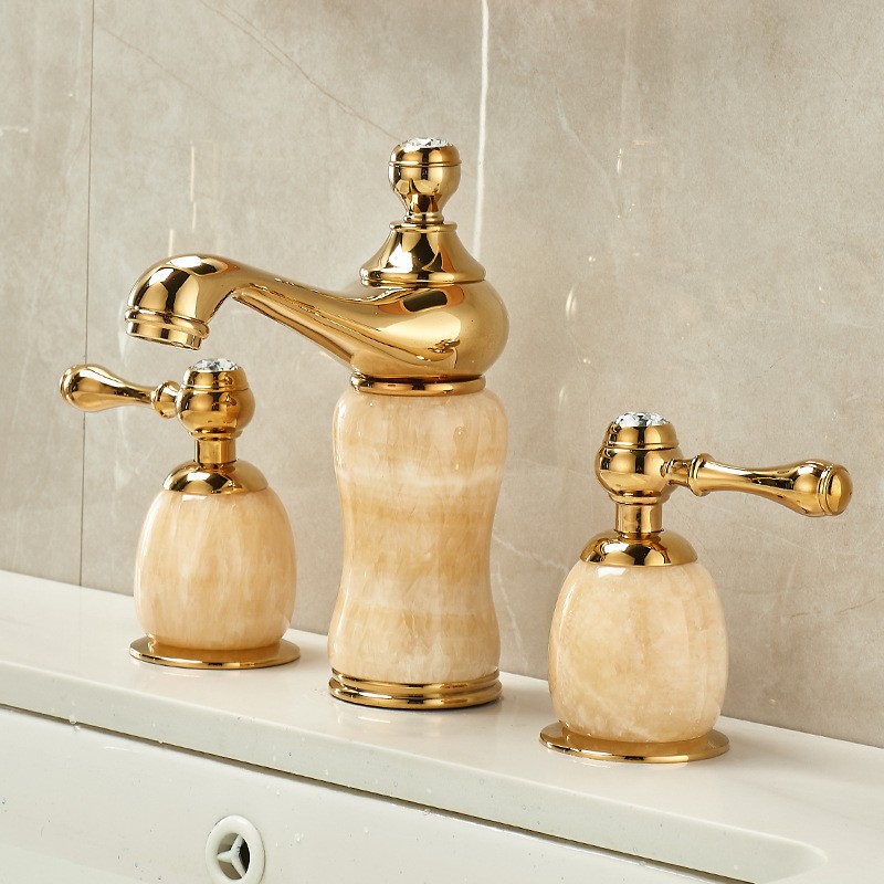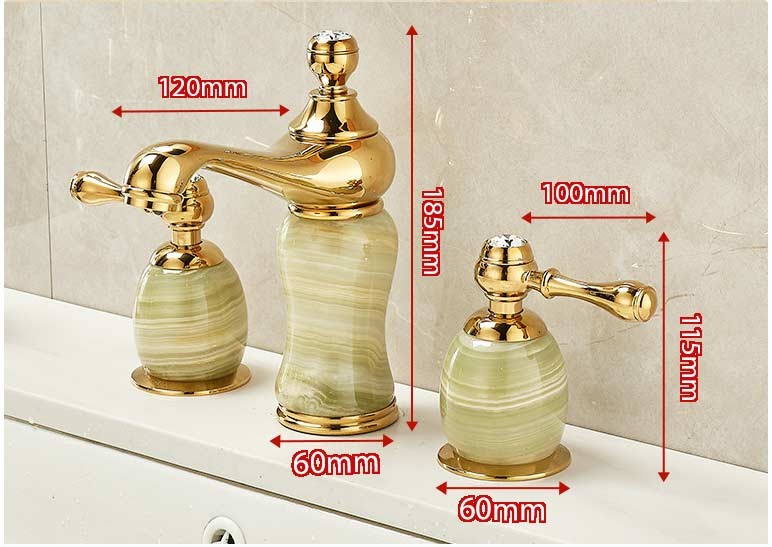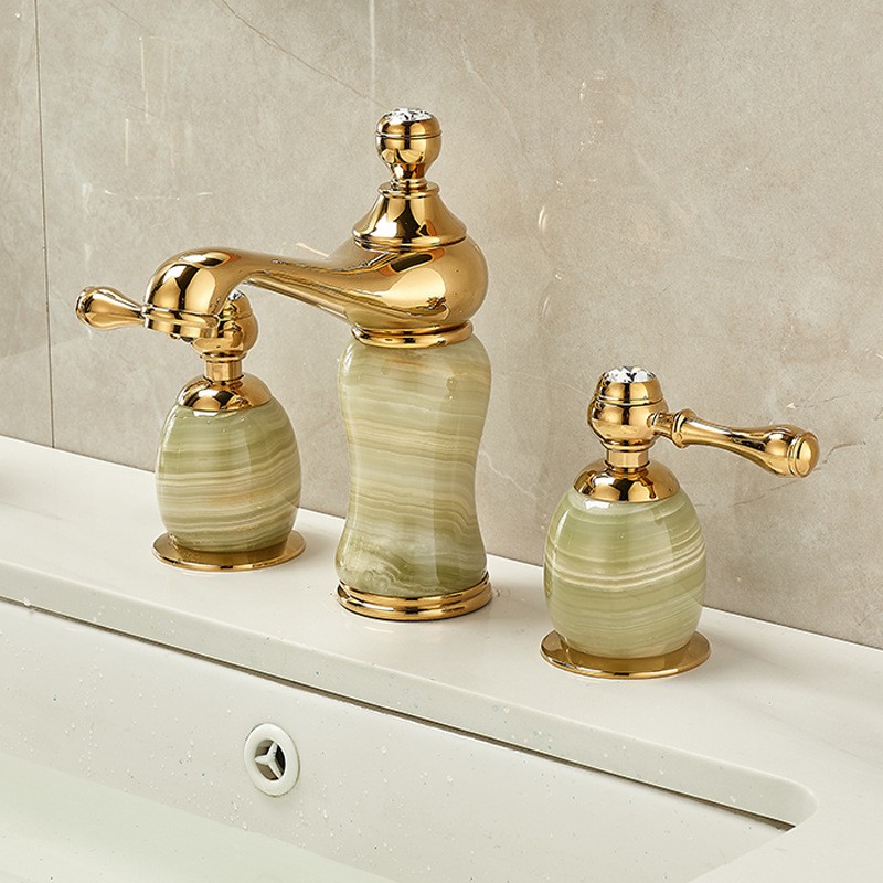 Розкішний трьохотворний змішувач YS579 виконаний у класичному стилі з декоративними вставками під нефрит. Корпус виготовлений із латуні з декоративним покриттям у золотому або рожево-золотому виконанні.