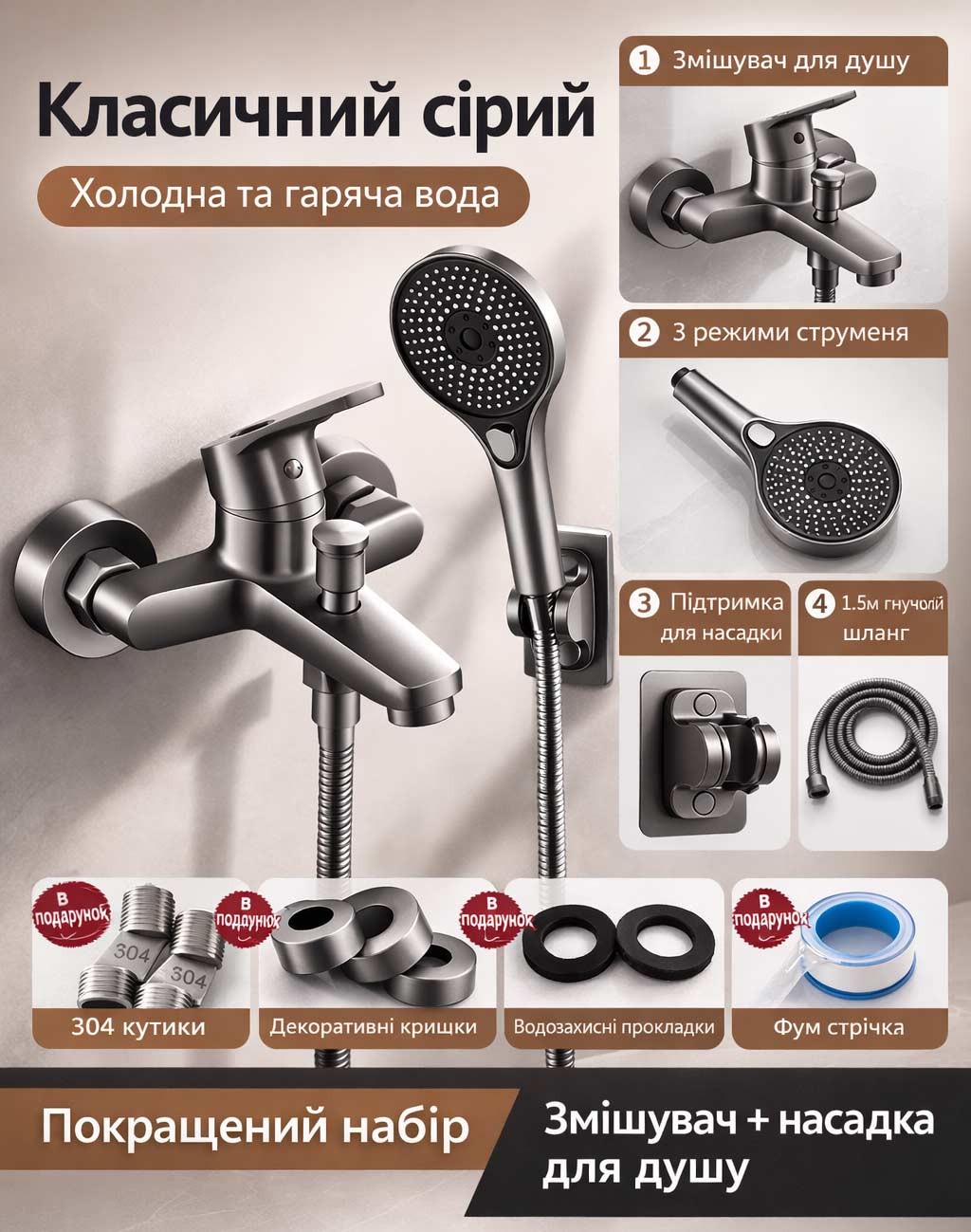 Модель оснащена повністю мідним клапанним механізмом і плавним одноважільним керуванням для точного регулювання температури та напору води. У комплект входить душова лійка з функцією підвищення тиску, настінний тримач та шланг 1,5 м.